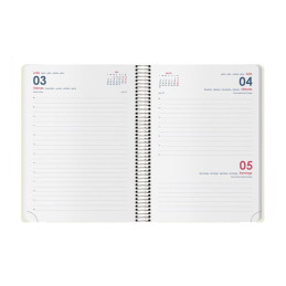 - Agenda de espiral - Perpetua, sin fechar - Semana vista - Cubierta de polipropileno - Portada personalizable - Uñero microperforado - Goma elástica - Espiral simple