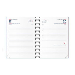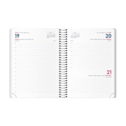 - Agenda de espiral - Perpetua, sin fechar - Día página - Cubierta de polipropileno - Portada personalizable - Uñero microperforado - Goma elástica - Espiral simple