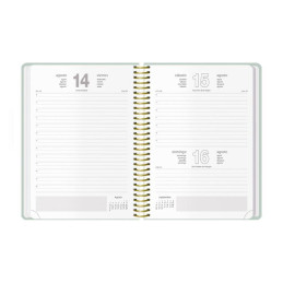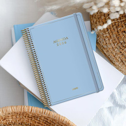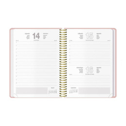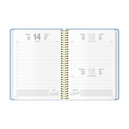 - Agenda de espiral - Perpetua, sin fechar - Semana vista - Cubierta de polipropileno - Portada personalizable - Uñero microperforado - Goma elástica - Espiral simple