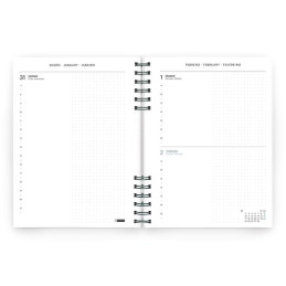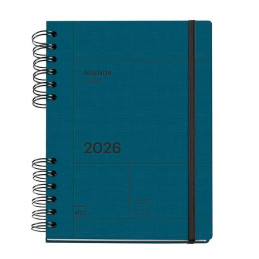 - Agenda de espiral - Semana vista - Cubierta de cartón 100% reciclado - Uñero microperforado - Goma elástica - Espiral simple - Papel reciclado