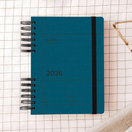 - Agenda de espiral - Semana vista - Cubierta de cartón 100% reciclado - Uñero microperforado - Goma elástica - Espiral simple - Papel reciclado