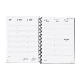 - Agenda de espiral - Perpetua, sin fechar - Semana vista - Cubierta de polipropileno - Portada personalizable - Uñero microperforado - Goma elástica - Espiral simple