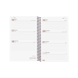 - Agenda de espiral - Semana vista - Cubierta de polipropileno opaco - Uñero microperforado - Goma elástica - Espiral simple