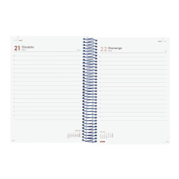 - Agenda de espiral - Semana vista - Cubierta de polipropileno opaco - Uñero microperforado - Goma elástica - Espiral simple