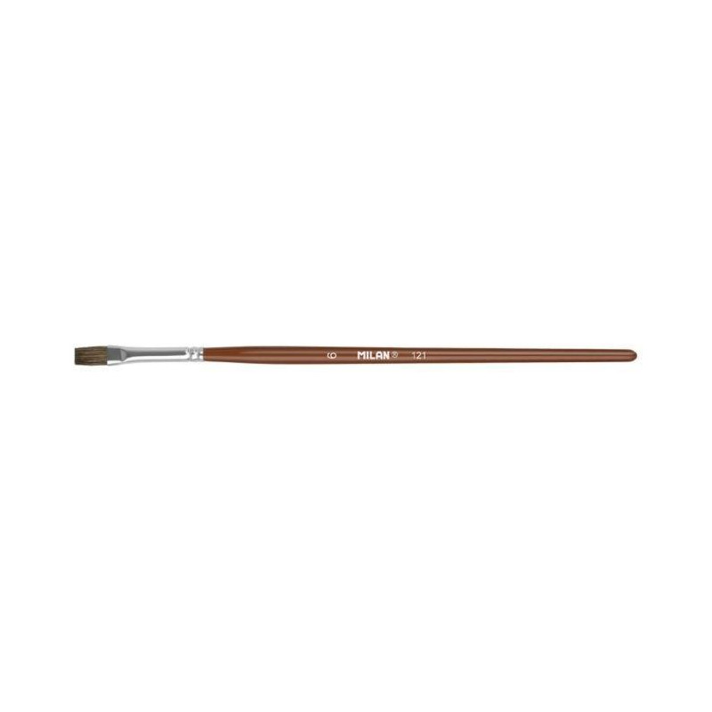 - Pincel plano con mango corto de madera - Barnizado en color natural y virola de aluminio - Composición: pelo natural de cerda Chungking - Adecuado para cola y barnices, témpera