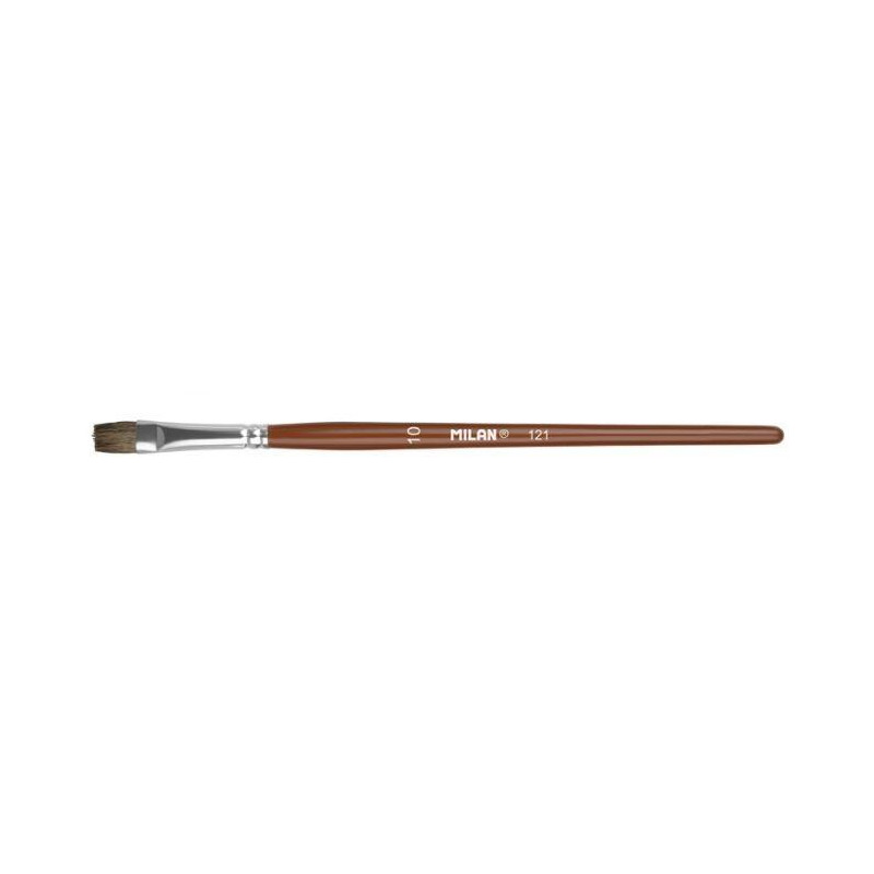 - Pincel plano con mango corto de madera - Barnizado en color marrón y virola de aluminio - Composición: 70% pelo natural de cabra + 30% sintético - Adecuado para acuarela y técnicas acuosas, témperas...