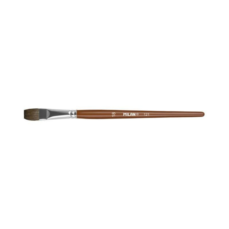 - Pincel plano con mango corto de madera - Barnizado en color marrón y virola de aluminio - Composición: 70% pelo natural de cabra + 30% sintético - Adecuado para acuarela y técnicas acuosas, témperas...