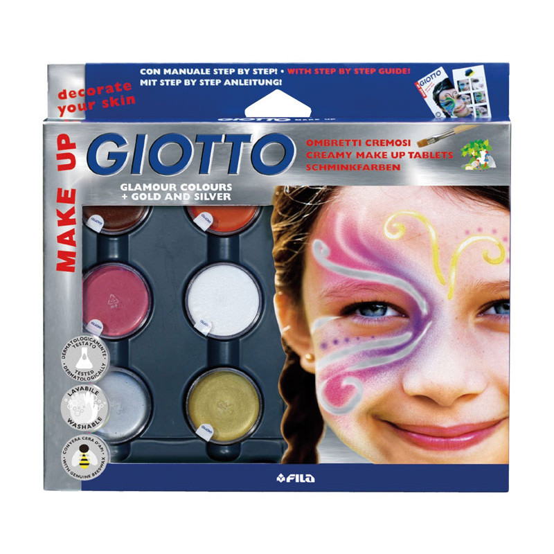 - Incluye 6 colores: blanco, oro, rosa, azul claro, gris y negro. - Textura suave. - Fácil de aplicar, se elimina fácilmente con una toallita - Contiene dos esponjas, un pincel y un folleto de sugerencias de maquillaje - Colores vivos y mezclables entre sí, de textura suave y agradable, no se seca - Totalmente libre de alérgenos y parabenos