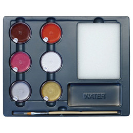 - Incluye 6 colores: blanco, naranja, rojo, marrón, verde y negro. - Textura suave. - Fácil de aplicar, se elimina fácilmente con una toallita - Contiene dos esponjas, un pincel y un folleto de sugerencias de maquillaje - Colores vivos y mezclables entre sí, de textura suave y agradable, no se seca - Totalmente libre de alérgenos y parabenos
