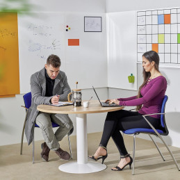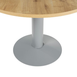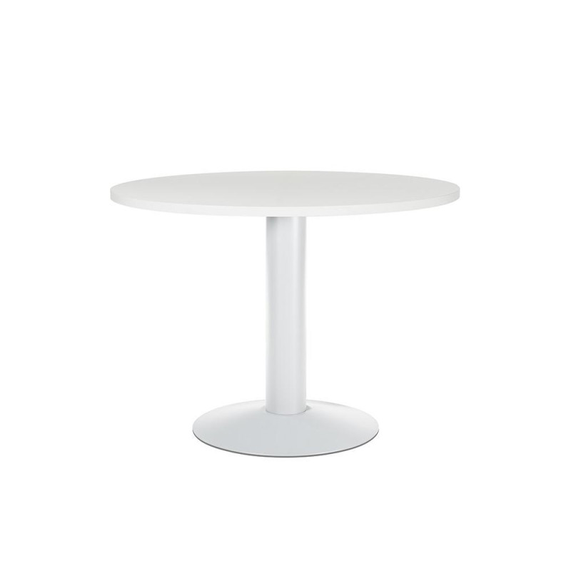 - Mesa de reunión - Forma circular - Sobre de melamina de 2,5 cm. de grosor - Canto de PVC de 2 mm. - Con pie de panel - Dimensiones: 100 cm. - Color: Aluminio - Blanco