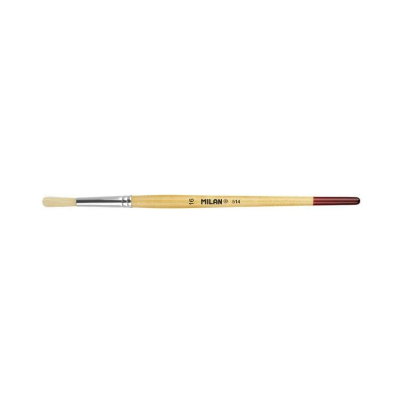 - Pincel plano con mango corto de madera - Barnizado en color natural y virola de aluminio - Composición: pelo natural de cerda Chungking - Adecuado para cola y barnices, témpera