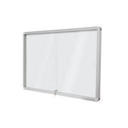 - Vitrina de sólida estructura en aluminio anodizado y cantoneras decorativas - Puertas correderas de metacrilato mediante mecanismo deslizante de rodamientos - Útil para el trabajo con imanes y figuras magnéticas - Permite la escritura con rotuladores especiales para pizarra blanca - Incluye elementos de fijación - Dimensiones interior: 84,5 x 114 cm.
